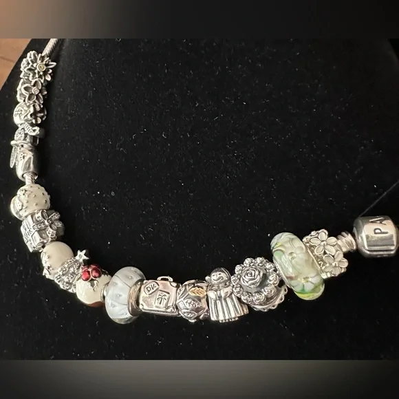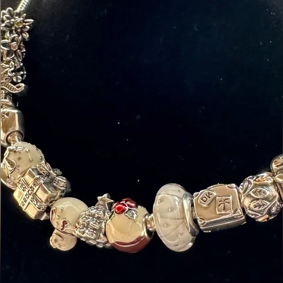 Snake bracelet includes the following charms: 2 different flowers charms (1 with citrine stones; 1 with 14k bezel set CZs); 2 different Murano glass charms; sterling charms include: money bag; musical note with CZs; symbol of peace dangle; heart with paw prints and sentiment; enamel reindeer snow globe; sparkling surprise gift; enamel snowman with Santa hat; Christmas tree; enamel Christmas plum pudding; adventure suitcase; tree of life with 4 14k leaves; and darling daisies charm. All charms are listed above. The bracelet and all charms are authentic Pandora. Hardly worn; excellent condition. PLEASE NOTE: The angel charm and birthday cake charm have been removed (sentimental reasons). I’ve edited and adjusted the price.