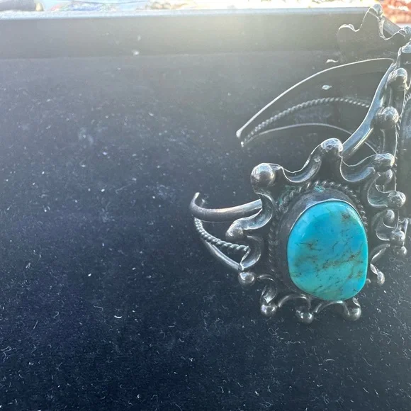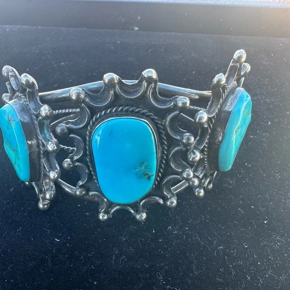 Turquoise bracelett Men or Women 925 silverVintagege from the Navajo Tribe stamped old turquoise 3 large stones cuff bracelet.