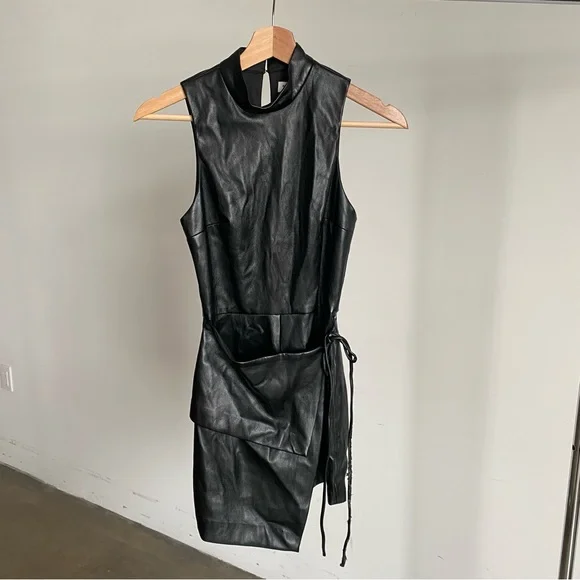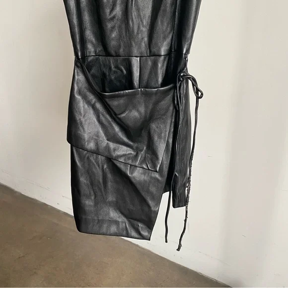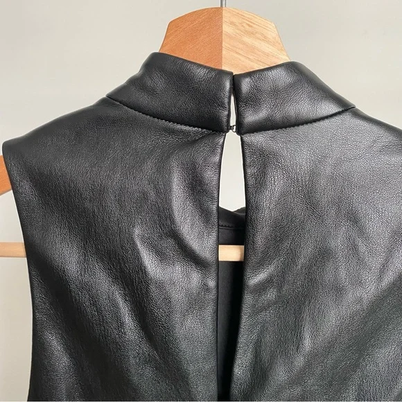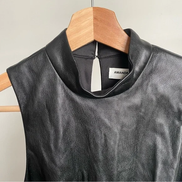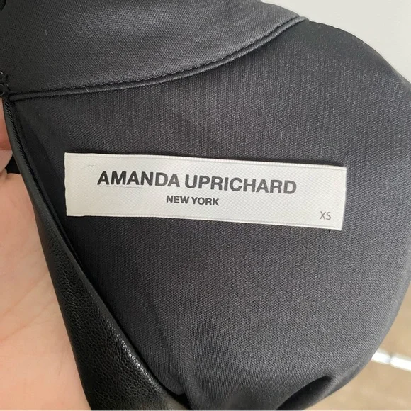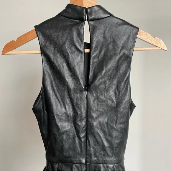 New Amanda Uprichard Black “Reed” Faux Leather RomperThis sleek black jumpsuit by Amanda Uprichard features a glossy faux leather finish and a modern sleeveless design. The fitted silhouette and high neckline create an edgy and sophisticated look, perfect for making a statement. Ideal for a night out, this jumpsuit combines style and comfort effortlessly. Lined. Back zip closure. Size: X-Small New without tags and defects: the faux leather is peeling on the lower front side tie closure. Please see last three pictures for details and remarks. Flaws were circled for extra clarity.**by purchasing this item, you attest that you have read and reviewed the listing and its corresponding pictures in their entirety.
