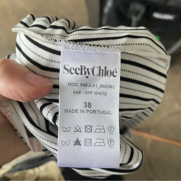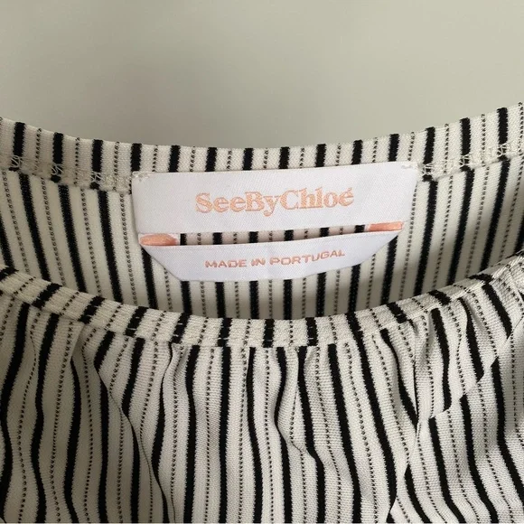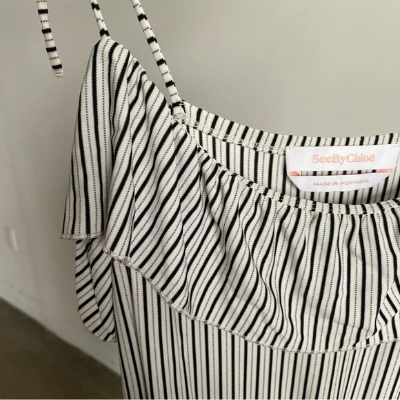 NWOT See by Chloe Striped Romper This elegant jumpsuit by See By Chloe features a striking black and white vertical stripe pattern, complemented by delicate spaghetti straps and playful ruffle details. The elasticized waist offers a flattering fit, while the lightweight fabric ensures comfort and style for warm weather occasions.Size: 38, which is a size Medium according to their size chart. New without tags**by purchasing this item, you attest that you have read and reviewed the listing and its corresponding pictures in their entirety.