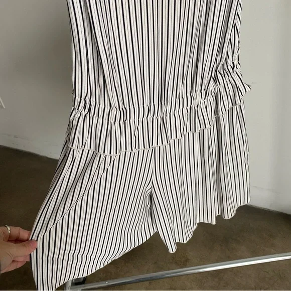 NWOT See by Chloe Striped Romper This elegant jumpsuit by See By Chloe features a striking black and white vertical stripe pattern, complemented by delicate spaghetti straps and...