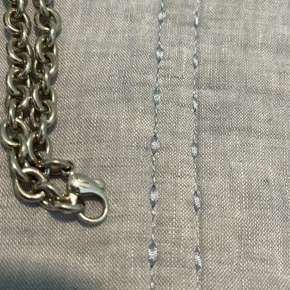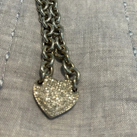 Really nice silver necklace with attached heart pave diamond pendant. It’s quite a weighty piece and has a very secure lobster claw clasp. This was made by the same company that makes the Tiffany necklaces. Purchased from QVCmany years ago but only worn a few times. 18”.