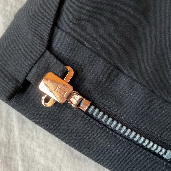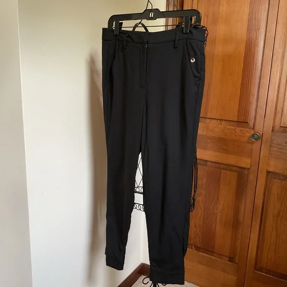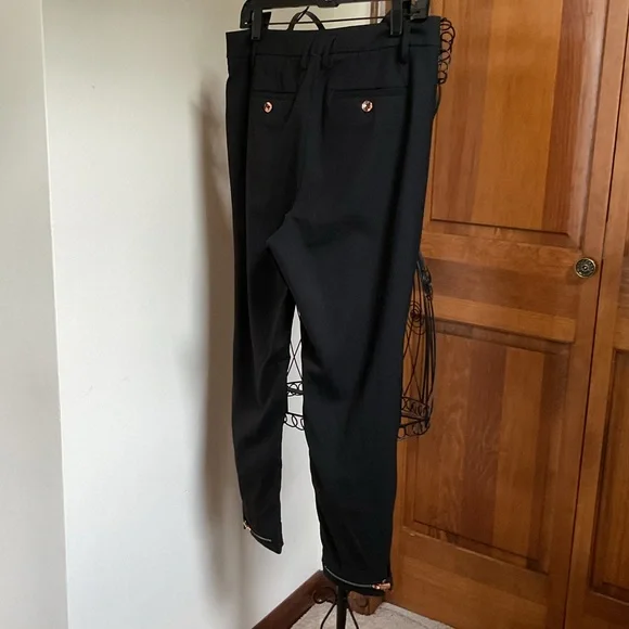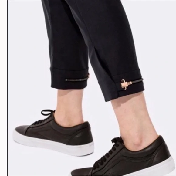 Kit and Ace high rise Bartlett pantsSize 4Waist 15”/30”Rise 12”Inseam 24”Black with rose gold detailFive pocketsRose gold buttonsWool with cashmere and spandex The rose gold zipper at hem can loosen or tighten the cuffs as desiredComfort and function from the former lululemon lead designer