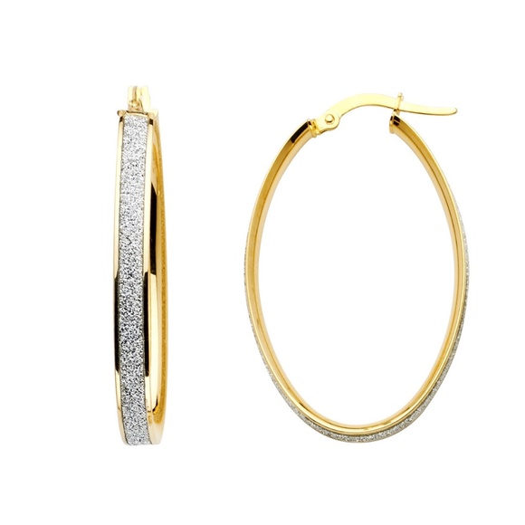 14k Two Tone 4mm Shimmer Satin Small Oval Hoop EarringsMaterial Type - 14k GoldMaterial Color - Two ToneFinish - SatinFinish - PolishedStyle - For HerEarring Backing - Hinge-Notch PostEarring Backing - LatchDiameter- 35MM Avg. Weight - 3.0 grams