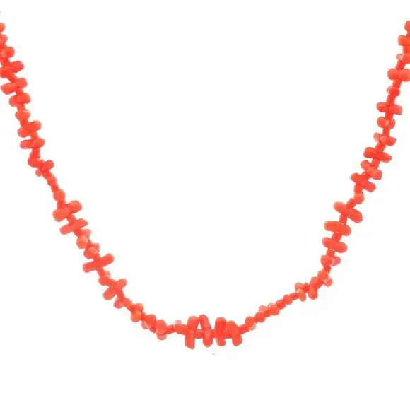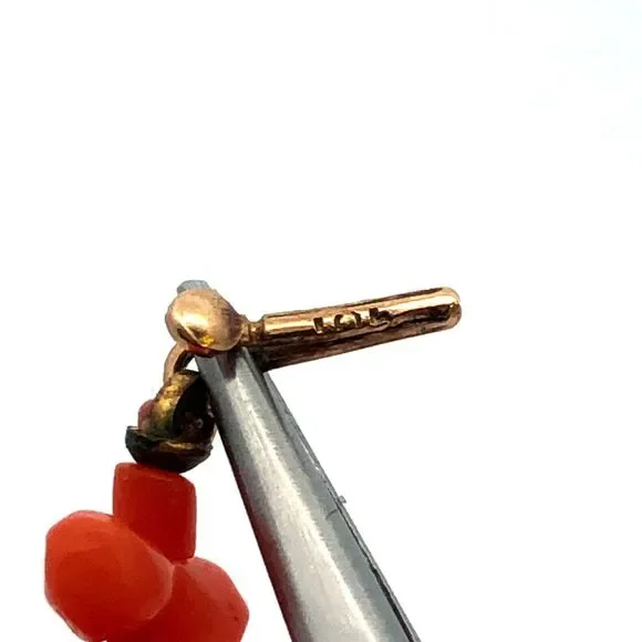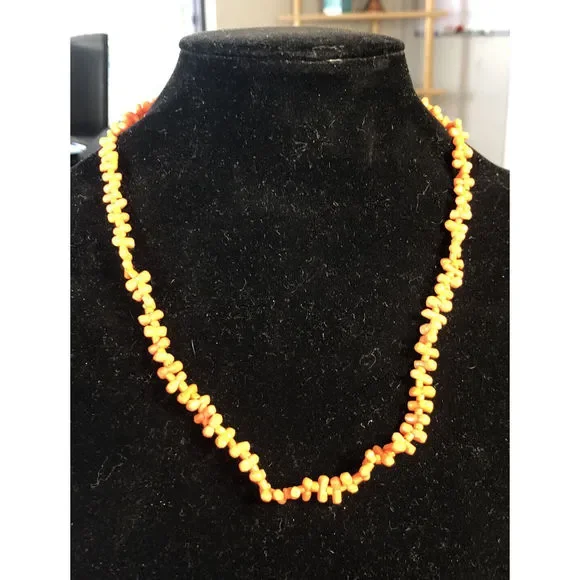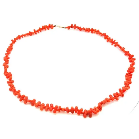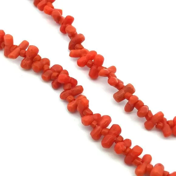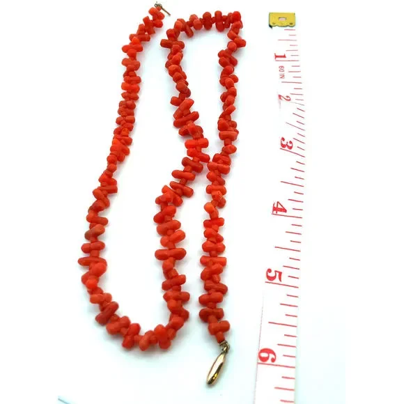 * Vintage 10K Yellow Gold Irregular Red Coral Beaded Statement Necklace* Length: 19"* Width: 5/16"* Weight: 17.3 tgw* Closure: Barrel* 101 Long Coral beads measure approximately...