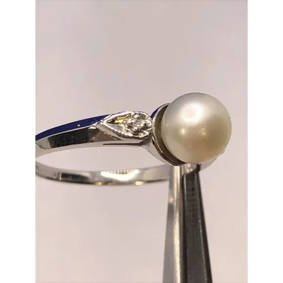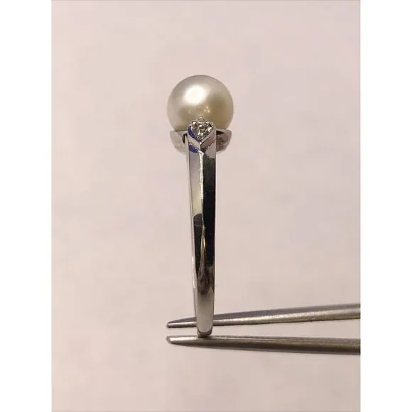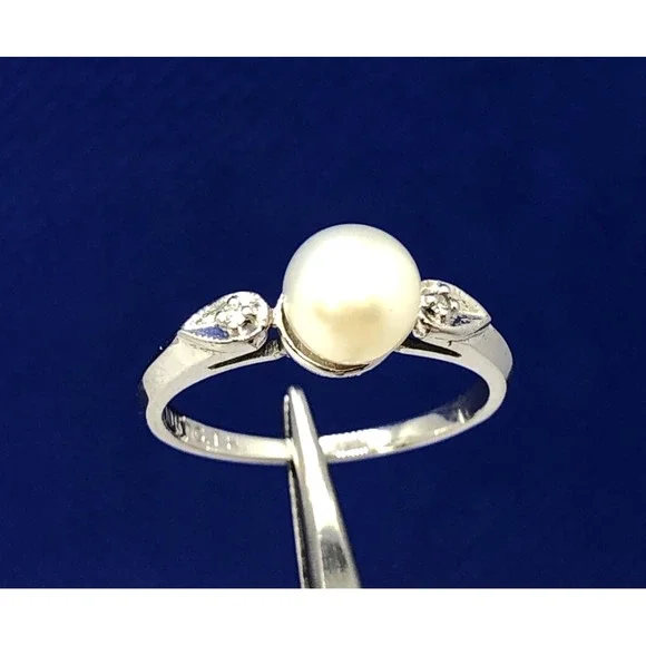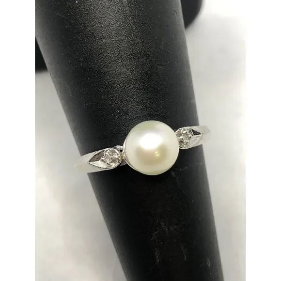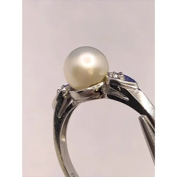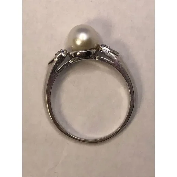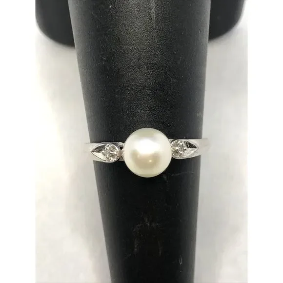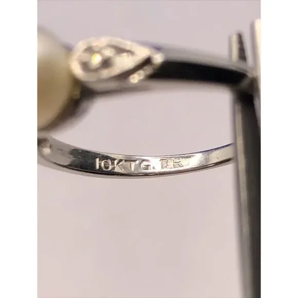 * Estate Designer 10K White Gold Round Pearl Diamond Accented Anniversary Ring* Ring size: 5.5 * Band width: 1.5 mm* Height: 5/16"* Top of ring measures: 9/16" x 1/4"* 1 Round Pearl measures approximately 6.3 mm * 2 Round Diamonds measure approximately 1.2 mm each* Weight: 1.8 tgw* Marked: T.G. T.K. * 10K* Ring can be resized for an additional fee.* Condition: As pictured.* G4125
