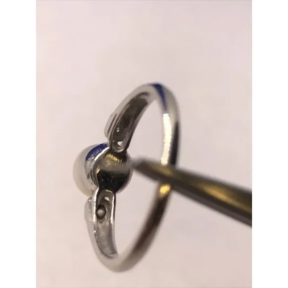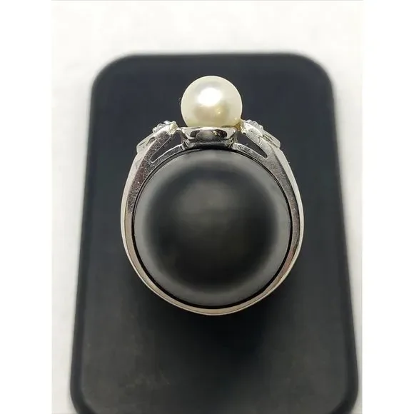 * Estate Designer 10K White Gold Round Pearl Diamond Accented Anniversary Ring* Ring size: 5.5 * Band width: 1.5 mm* Height: 5/16"* Top of ring measures: 9/16" x 1/4"* 1 Round...