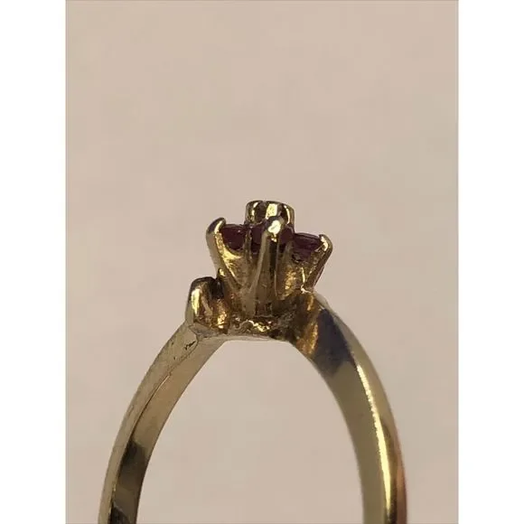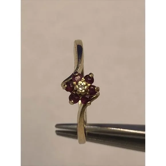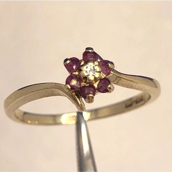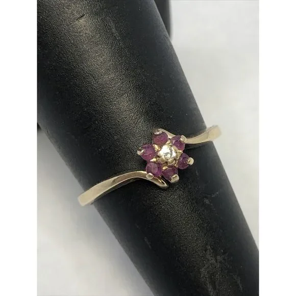 * Designer GTR 10K Yellow Gold Round Purple Ruby Diamond Flower Promise Ring* Ring size: 6.25* Band width: 1.5 mm* Top of ring measures: 1/4" x 1/4"* Height: 1/4"* 1 Round Diamond measures approximately 1.5 mm* 6 Ruby rounds measure approximately 1.8 mm each* Weight: 1.9 tgw* Marked: 10KP * GTR* Ring can be resized for an additional fee.* Condition: As pictured.* G4131