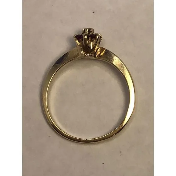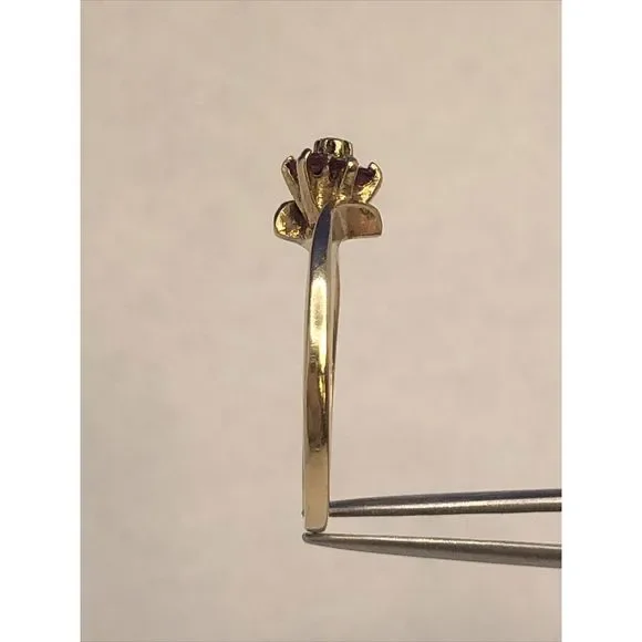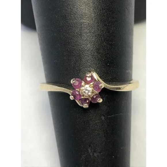 * Designer GTR 10K Yellow Gold Round Purple Ruby Diamond Flower Promise Ring* Ring size: 6.25* Band width: 1.5 mm* Top of ring measures: 1/4" x 1/4"* Height: 1/4"* 1 Round Diamond...