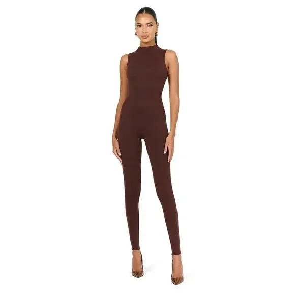 Naked Wardrobe NWOT Brown The NW Sleeveless Jumpsuit Size SBlack jumpsuitSleevelessScoop neckBodyconZip up backApproximate Measurements Laying flat without stretching:Armpit to...