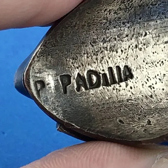 * Navajo P Padilla Signed 925 Sterling Silver Chunky Green Blue Turquoise Ring* Ring size: 10.75* Top of ring measures: 1-1/2" x 1.0"* Turquoise chunks measure: approximately 15.6 mm x 17.04 mm and 17.03 mm x 8.20 mm* Ring weight: 34.7 tgw* Marked: P Padilla * Professionally assayed to insure metal fineness* Condition: As pictured, in great condition. Nice, rich patina!* S1321* DT