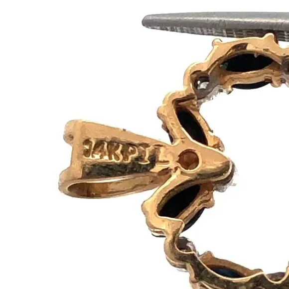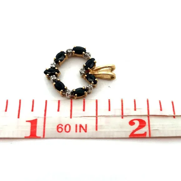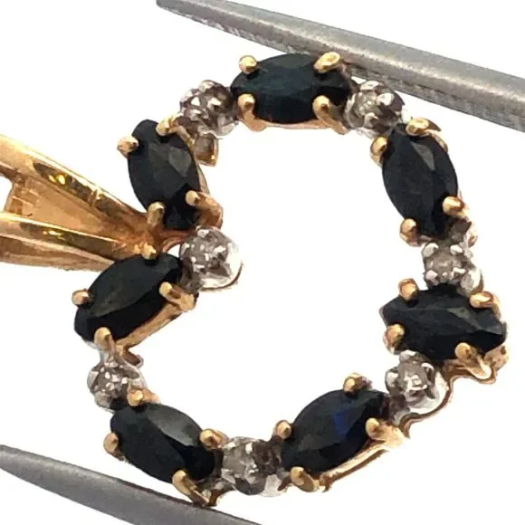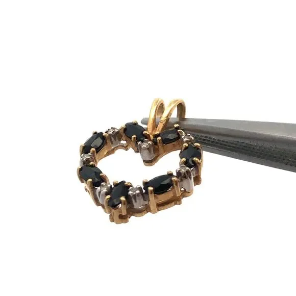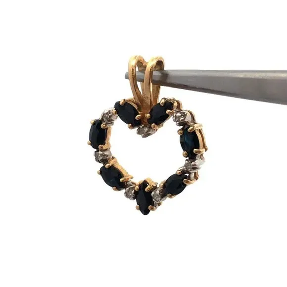 * Designer 14K Yellow Gold Marquise Sapphire Diamond Accented Heart Pendant* Length: 3/4" including the bale* Width: 9/16"* Seven marquise cut blue Sapphires measure approximately 3.9 mm x 2.4 mm each* Seven round cut diamonds measure approximately .80 tgw* Pendant weight: 1.4 tgw* Marked: 14K * PIL* Chain is not included, but can be purchased for an additional price.* Condition: As pictured.* G3357