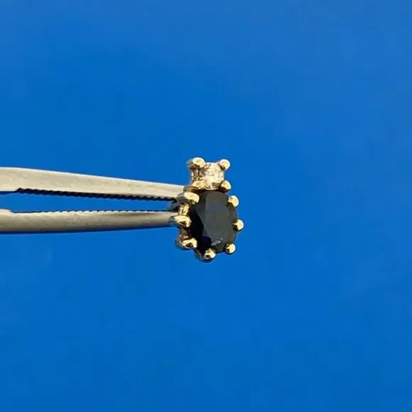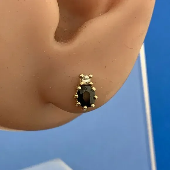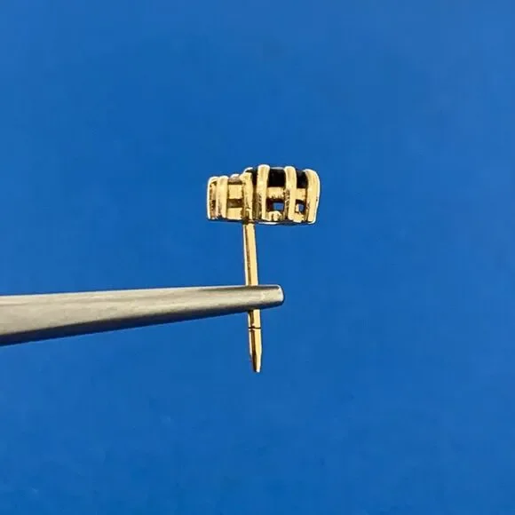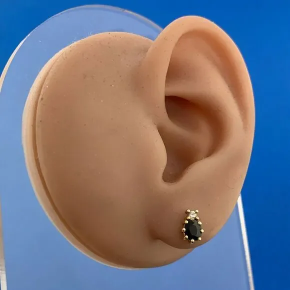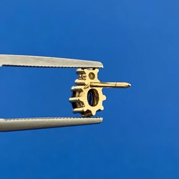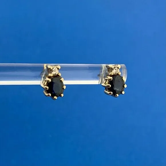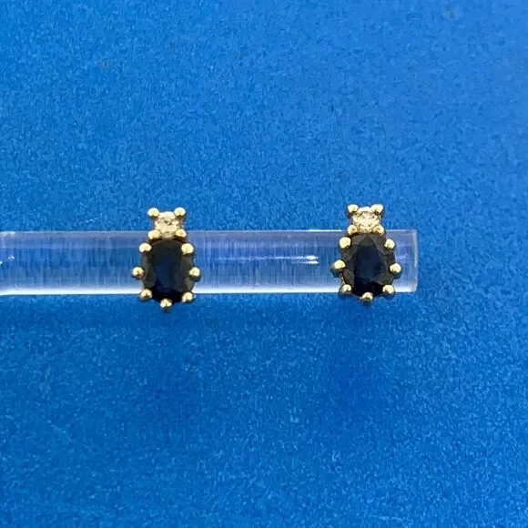 * 14K Yellow Gold Oval Blue Sapphire Diamond Accent Stud Earrings* Length: 5/16"* Width: 3/16"* Oval Sapphires measure approximately 4.75 mm x 3.5 mm each* Round Diamonds measure approximately 2.0 mm each* Marked: 14K* Fastening: Butterfly-NOT INCLUDED* Condition: As pictured.* G3154