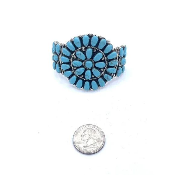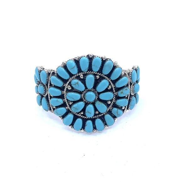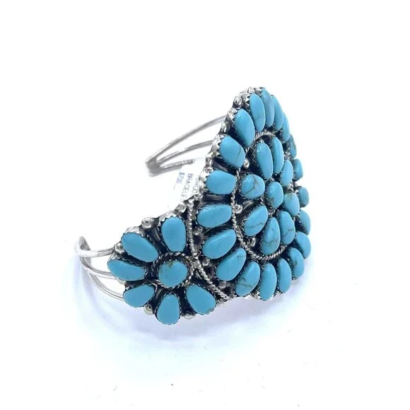 This beautiful bracelet is a true work of art by Native American craftsmen. The sterling silver cuff features a stunning cluster of turquoise stones, each with a unique blue...