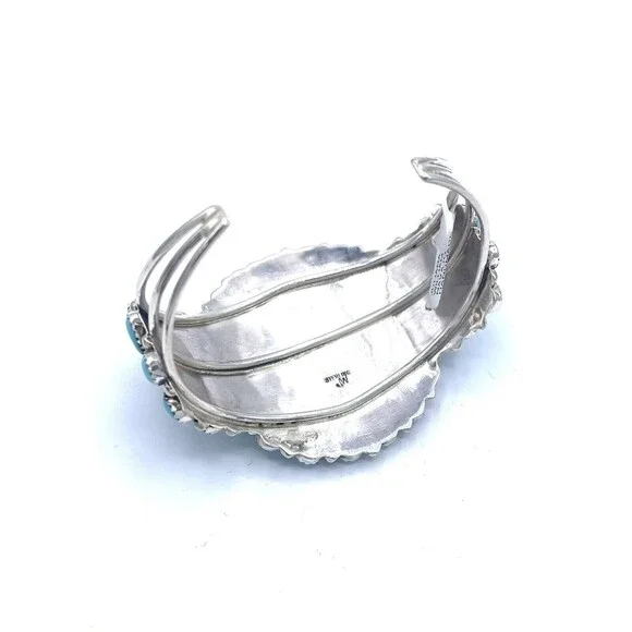 This beautiful bracelet is a true work of art by Native American craftsmen. The sterling silver cuff features a stunning cluster of turquoise stones, each with a unique blue color. The bracelet is perfect for anyone who loves ethnic and regional jewelry, and it would make a great addition to any collection.The bracelet is made with the highest quality materials, including sterling silver and turquoise stones. It is a perfect representation of Navajo culture and will be a great conversation starter. The bracelet is a must-have for anyone who appreciates handmade jewelry and wants to add a touch of Native American style to their wardrobe.Artist: Juliana WilliamsMeasures 6 1/2 from tip to tipInside gap opening 1 1/2Will fit any front 6 to 7 inch can be adjusted 1 inch bigger or smaller to insure fitmentWeighs ~40 gramsTHANK YOU FOR YOUR BUSINESS, IF YOU HAVE ANY QUESTIONS PLEASE LET ME KNOW :)ALSO IF YOU ARE LOOKING FOR A PARTICULAR ITEM PLEASE LET ME KNOW!