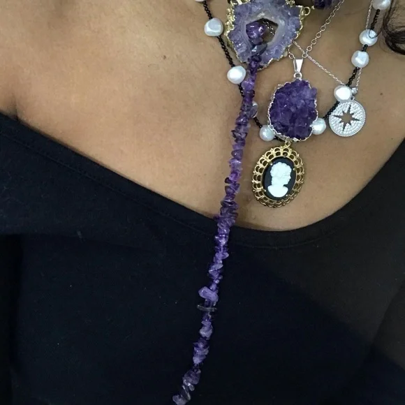 Talk about layers ! This set features a lariat made of amethyst chips , the richest yummiest purple ,, finished with a baroque pearl , the sliced amethyst geode acts as the receiver for the lariet, loopthrough , wear long short or doubled.Starburst rodium plated brass pendant on a sterling silver chain , A necklace with freshwater pearls and 2mm semi precious black beads with a vintage cameo pendantThe richest purple amethyst druzy on a silver chain If you want just one ask