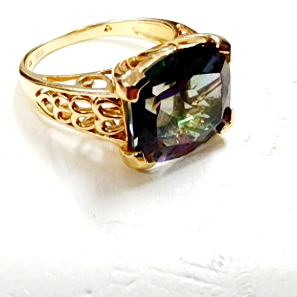 Elegant 10k gold ring featuring a stunning square-cut Mystic Topaz gemstone with vibrant shifting colors. The intricate filigree design adds a timeless touch to this beautiful piece.