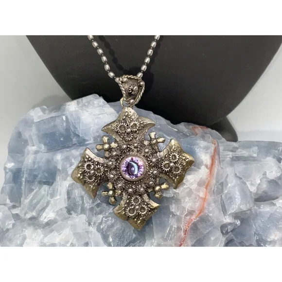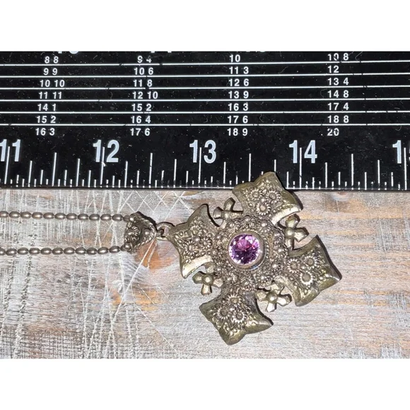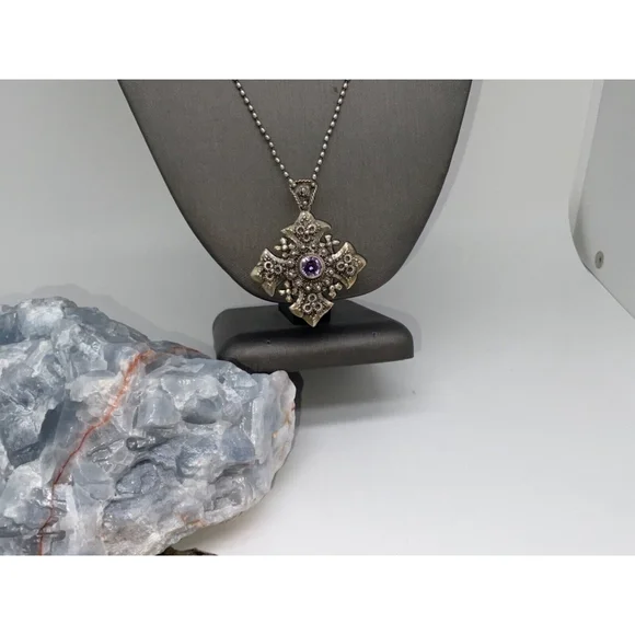 This beautiful JERUSALEM CROSS pendant is made of 925 sterling silver and comes with a 24-inch 925 chain. The pendant features a round amethyst stone and a stunning bezel setting...