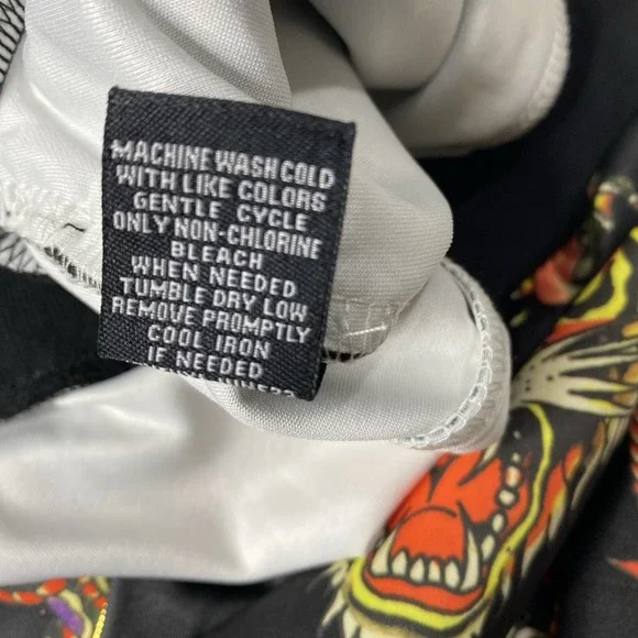 Elevate your streetwear game with these Ed Hardy Flashboard Track Pants. The black and gold color scheme, with a tiger skull print, makes these pants a bold statement for any casual or travel occasion. The relaxed fit and wide-leg style provide comfort and freedom of movement, while the elastic waist and drawstring closure ensure a secure fit.These pants feature a blend cotton fabric type, with pockets and a flat front design. They are machine washable and made of polyester and spandex materials. Perfect for any season, these track pants are a must-have for any fashion-forward woman who wants to add a touch of edginess to her wardrobe.Please review all pictures carefully for details and measurements.Thank you!