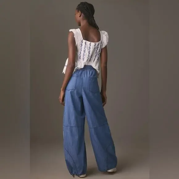 New with TagsSize X-SmallAnthropologie Pilcro Pieced Pull On Jogger JeansBlue denimCottonSide slant pocketsBack patch pocketsPull-on stylingElastic waistMachine washMeasurements...