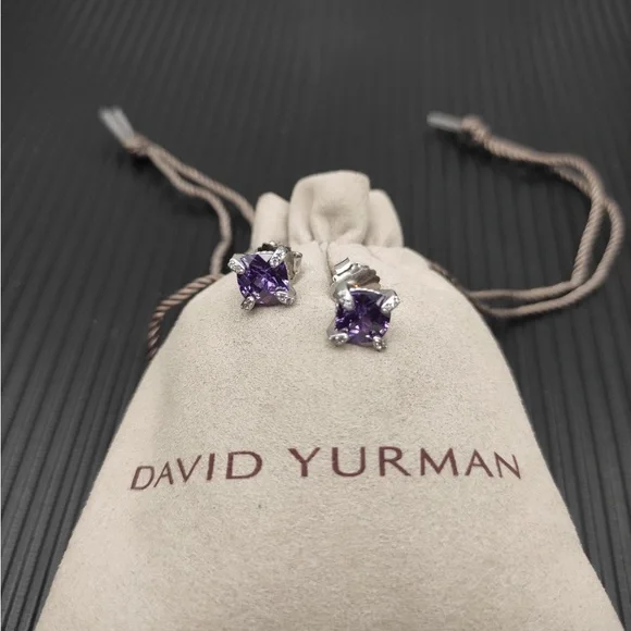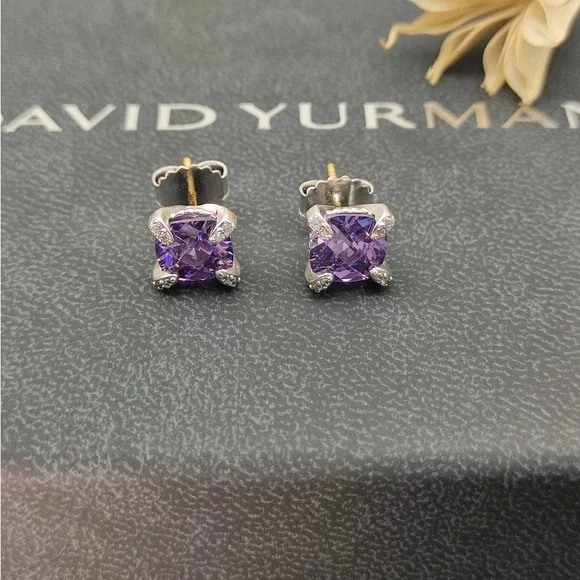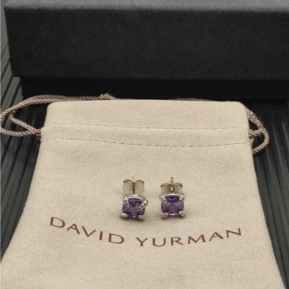 Elegant and timeless David Yurman stud earrings featuring 8mm faceted amethyst stones set in classic four-prong sterling silver settings.- Gemstone: 8mm round amethyst (purple)- Setting: Four-prong mount- Metal: 925 sterling silver- Signature David Yurman cable detail around the base- Butterfly post back for secure fit- Stamped with DY and 925 hallmark- Brand new, never worn- Comes with original David Yurman box and dust pouch- Purchased from official David Yurman websitePerfect for daily wear or as a refined gift — subtle sparkle with iconic DY style.Ships quickly from a smoke-free home.