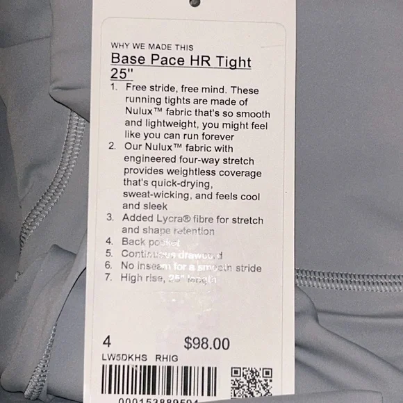 Released 11/2024 New with tagsSize 4 Base Pace High-Rise Tight 25"Rhino GreyFree stride, free mind. These running tights are made of Nulux™ fabric that´s so smooth and lightweight, you might feel like you can run forever.nulux™Nulux™ fabric is quick-drying, sweat-wicking, and offers lightweight coveragehigh rise, 25" lengthIntended to sit above anklefeaturesDesigned for: RunLycra®: Added Lycra® fibre for shape retentionBack pocket: Holds your essentialsContinuous drawcord: Won´t get pulled inside or lost in the washReduce chafe: No inseam means less inner thigh chafingRise and inseam: High rise, 25" inseam#Activewear, #GymWear, #WorkoutClothes, #FitnessFashion, #Sportswear, #TrainingGear, #AthleticWear, #GymStyle, #FitnessStyle, and #RunningGear. #YogaWear, #BoxingShorts, #ThaiShorts. #Fitness, #Workout, #Gym, #FitFam, and #FitnessMotivation
