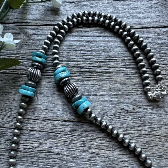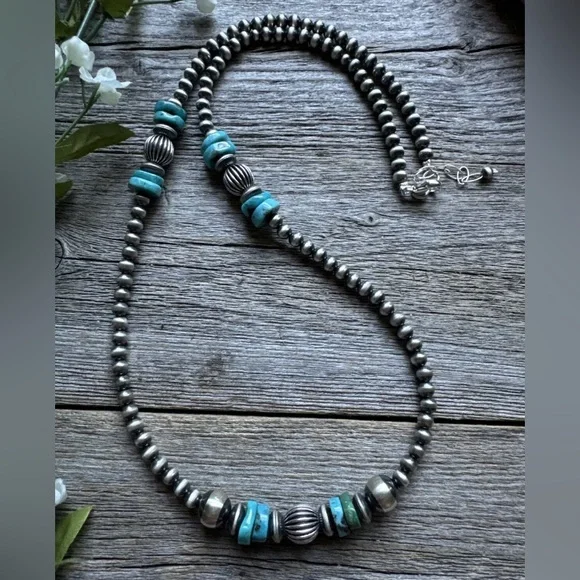 Sterling Silver Blue Turquoise W Pearls Bead Necklace. 24 inch