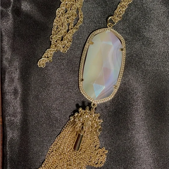 This is an older Kendra Scott Rayne (no tarnish) with a very rare iridescent agate stone.The stone was from one of the luxe Jamie necklaces, so it is not an exact fit in the Rayne. I did not want to damage the stone or setting so I did not alter the stone. Iridescent coating is in great shape. The stone is gorgeous!