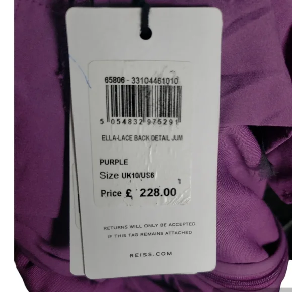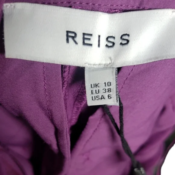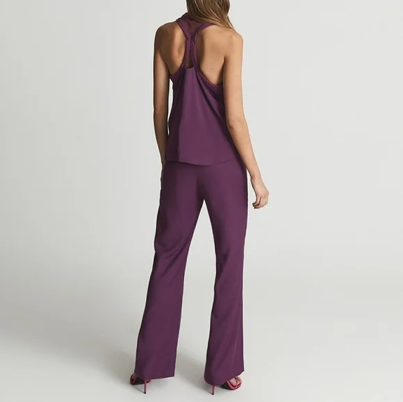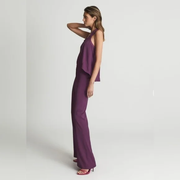 Gorgeous Jumpsuit By REISS * Seam came undone at back zipper, please see photo *EllaNWT / New Color Purple Lace BackThe Ella is a modern take on the classic jumpsuit. It´s cut in a sleeveless design with a wide-leg silhouette and features lace detailing to the reverse. This piece is crafted in a design that replicates the look of a coordinating top and trousers from the reverse. Wear with barely-there heels for a playful outfit with refinement.Product Code: T57-905Main 97% Viscose, 3% Elastane. Lining 90% Polyester, 10% ElastaneREISSReiss celebrates classic style with a directional approach and a permanent focus on craftsmanship. Head here for sharp workwear with desk-to-dinner potential, and statement-making occasion wear.Tags: vacation, resort wear, office, work, lunch dates, casual, summer, spring, fall, winter, dress up or down, comfortable, travel wear, great gift, great with heels, sandals or boots