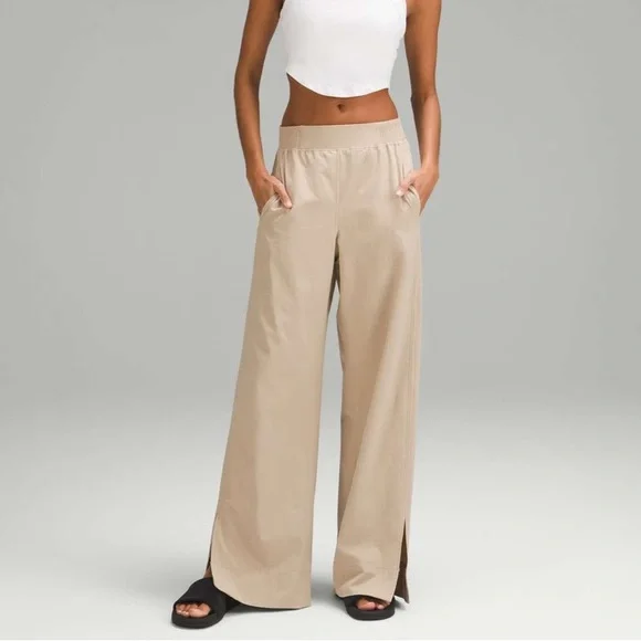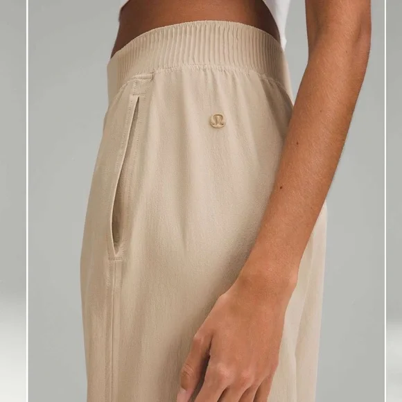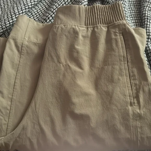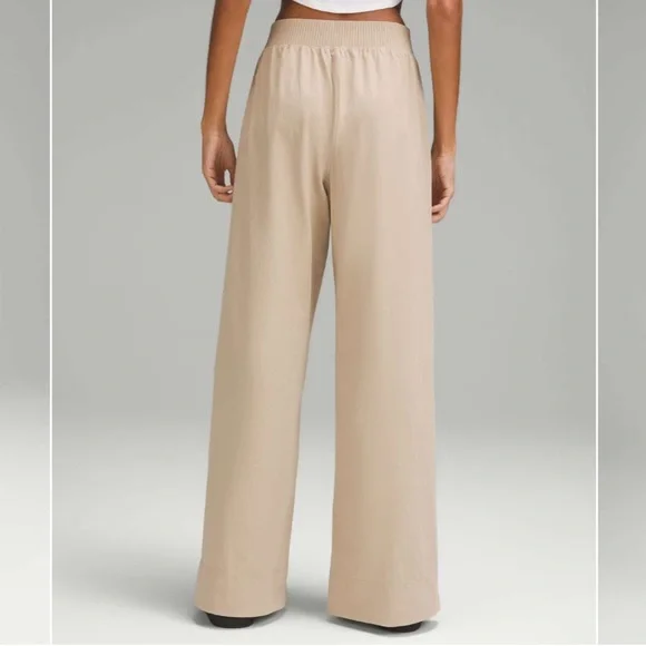 Elevate your style with these chic tan wide-leg pants. Perfect for any occasion, they offer comfort and elegance. These are lightweight and in the nulu fabric. These have pockets and a stretchy waistband. These are in excellent condition