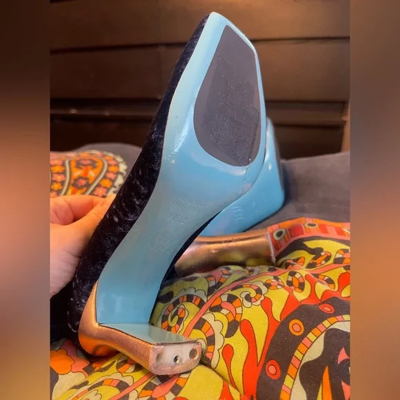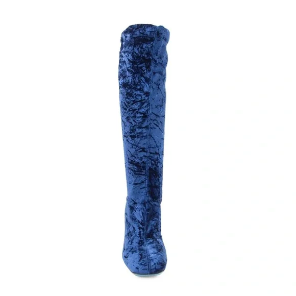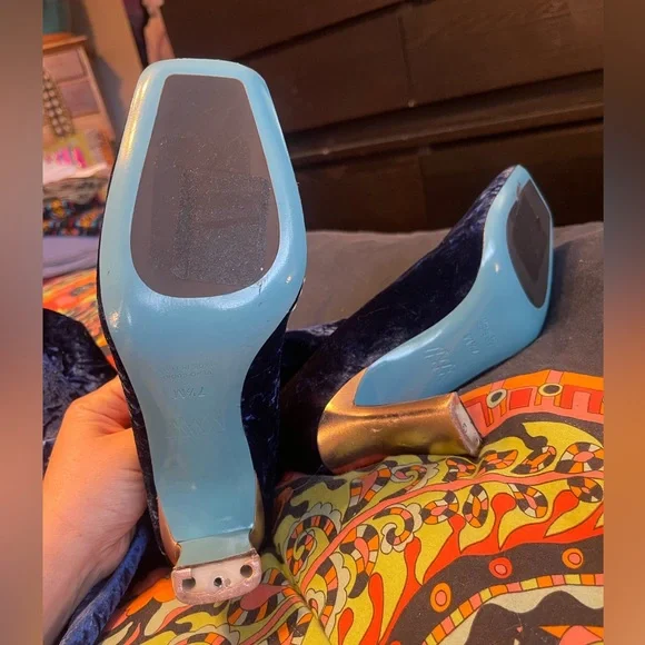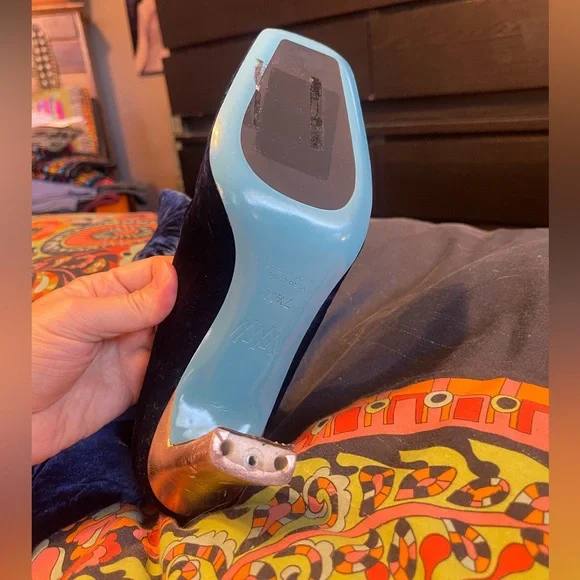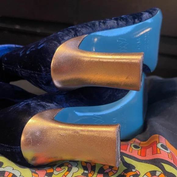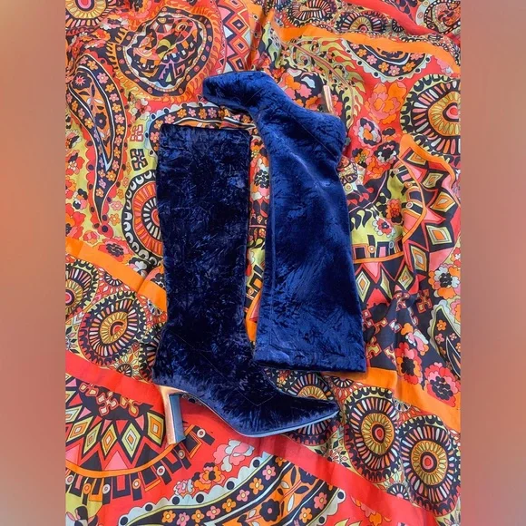 Wolf & BadgerValentina RangoniLeonida Tall Boot Blu Vissz 7.5Stunning Blue Velvet Knee High Boots PLEASE READ CONDITION Currently exclusively from Wolf & Badger for $430, you can get this pair for a steal, NOTE THESE FLAWS: These boots need the taps of the heels replaced. In stock photos there is a heel tap shown. In the images showing the boots for sale, note the condition of the heels and the missing heel taps. There are some scrapes on the metallic foil of the heel. These will need to be taken to a cobbler or shoe repair to have the heel taps replaced and they are priced accordingly. So a major steal for you! The Leonida over the knee boot is crafted in luxurious royal blue Italian stretch velvet, mounted on a modern heel, with a flared base for added comfort and stability. Featuring an elegant silhouette and a meticulous, minimal aesthetic. Valentina Rangoni was born from an idea of Carolina and Valentina Rangoni, two Florentine sisters who have always been passionate about fashion and with an expertise in women´s shoes design & production handed down across three generations.Since 1934 the Rangoni family has been designing and producing handcrafted Italian shoes, without ever having stopped. After more than 80 years of history in women´s footwear, Carolina and Valentina have decided to create the Valentina Rangoni Brand: a concept that combines quality, craftsmanship, fashion and technology.tagsglam david bowie rocknroll rockstar florence welch
