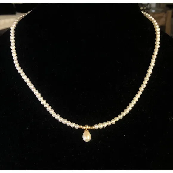 * Designer 14K Yellow Gold White Pearl Beaded Teardrop Pendant Necklace* Length: 16-1/2"* Pendant length including bale: 1/2" * Pendant width: 1/4"* Weight: 8.7 tgw* 117 Pearls...