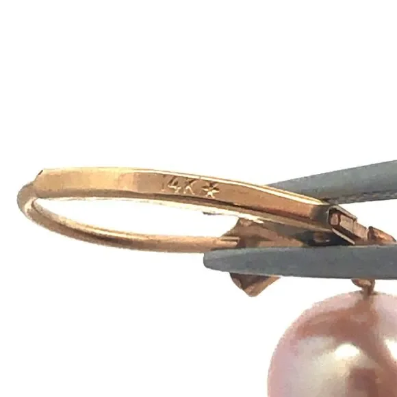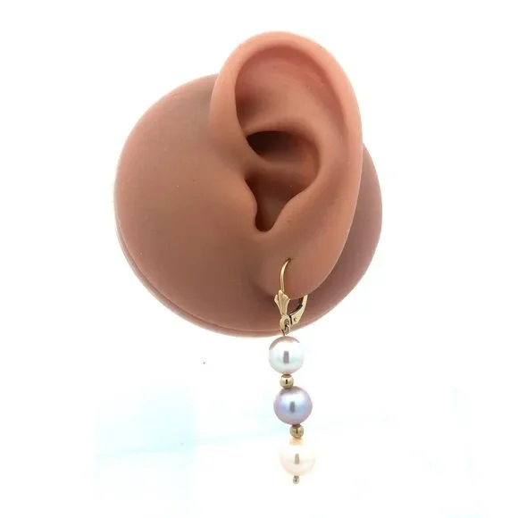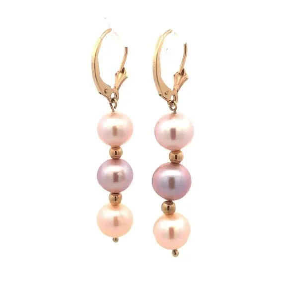 * Designer 14K Yellow Gold Round Pink Pearl Beaded Dangle Earrings* Length including hook: 1-7/8"* Width: 5/16"* Weight: 5.3 tgw* 6 Round Pearls measure approximately 7.8 mm each* Closure: Lever back * Marked: 14K * Makers Mark* Condition: As pictured. ( H )* G4439