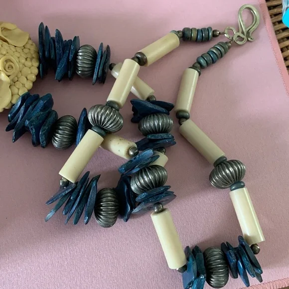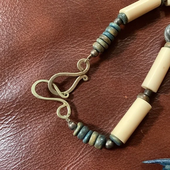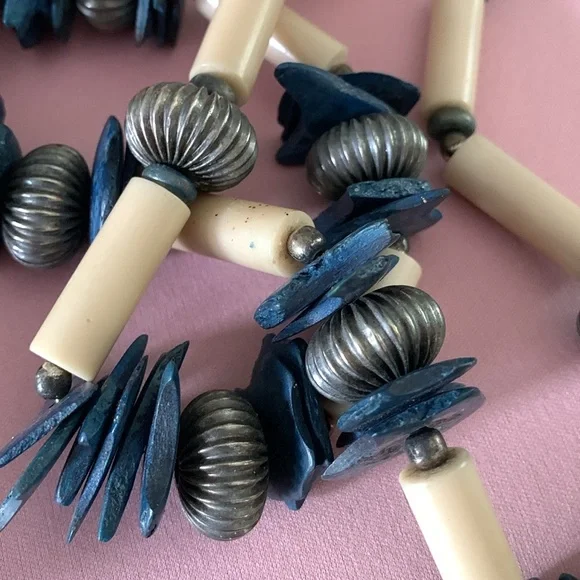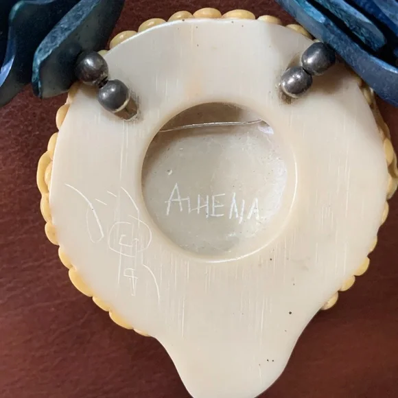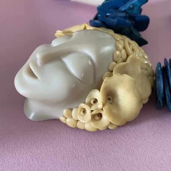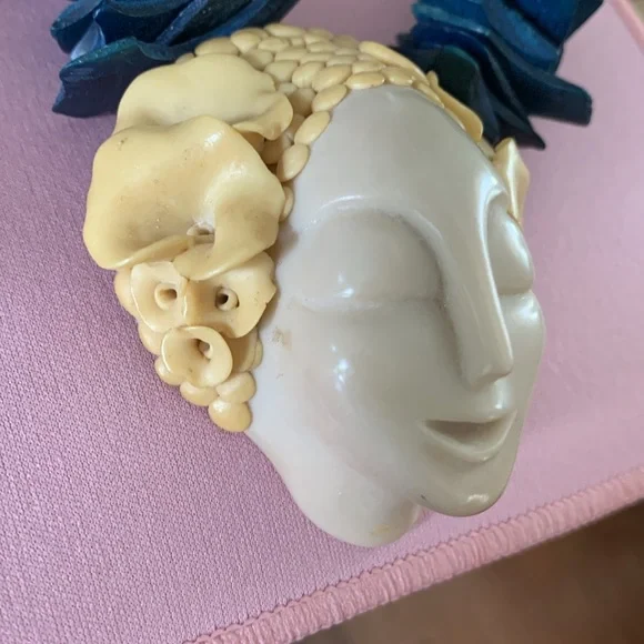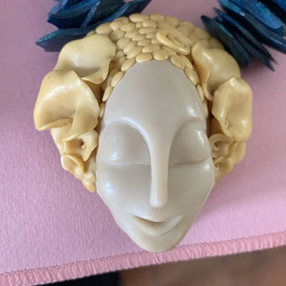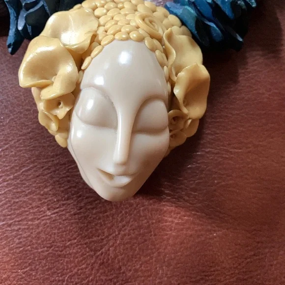 Beautiful necklace of a woman’s serene face adorned with a floral crown. The pendant is suspended from the necklace with complementary long beads, silver fluted beads with a sterling silver clasp. The origin of the bluish beads is not known to me. I am not an expert on vintage jewelry. The item is signed, but could find no information. The ladies head is 2 1/2” x 2 1/4”.the length of the chain is approximately 13” from the top of the pendant and including the full length of the pendant 15 1/2” long.It is a beautiful piece and very good condition.