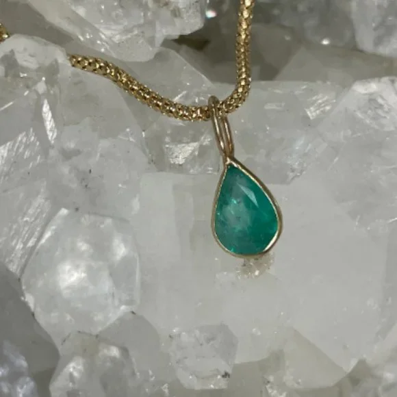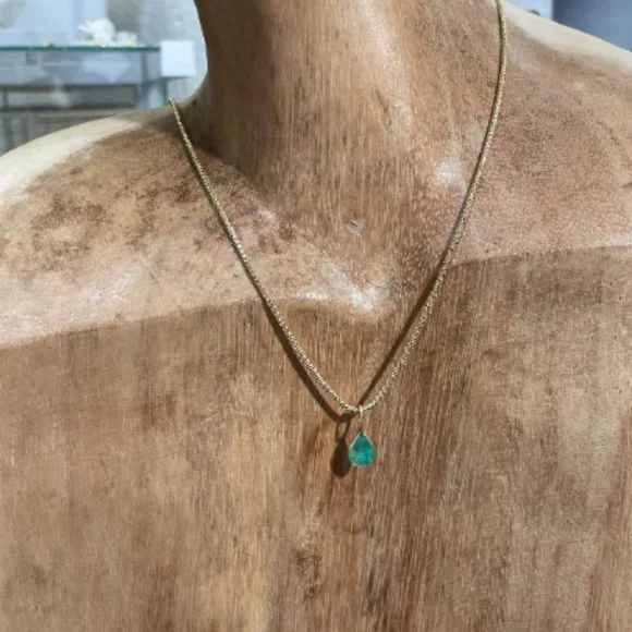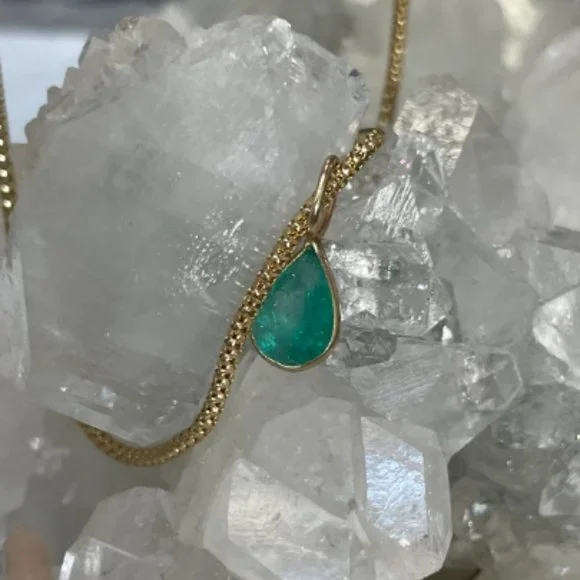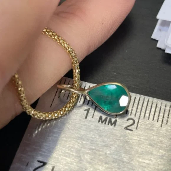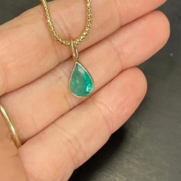 Featuring a gorgeous and vibrant natural emerald with a pear cut shapeHand wrapped in solid 14K yellow gold with a bail on top.The bail opening is 5x4mm.The measurement in the title indicates the measurement of the pendant from the top of the bail to the bottom.The emerald is natural and earthmined.Perfect to wear alone or paired with another pendant.Please note that the pendant is sold alone and without the necklace it is displayed on.All of our pieces are made with natural gemstones and solid 14K yellow gold.Please reach out with any questions or requests, bundle deals available!