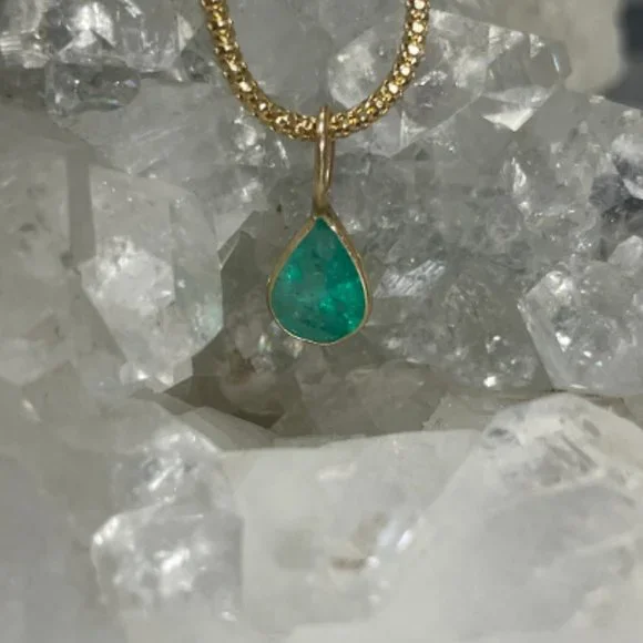 Featuring a gorgeous and vibrant natural emerald with a pear cut shapeHand wrapped in solid 14K yellow gold with a bail on top.The bail opening is 5x4mm.The measurement in the...