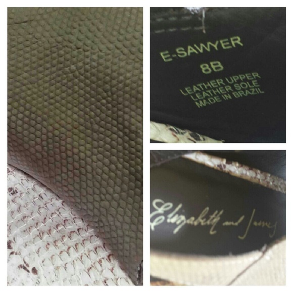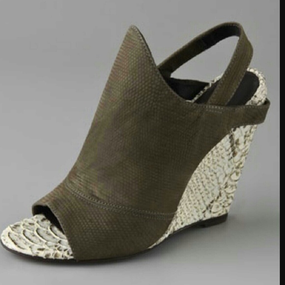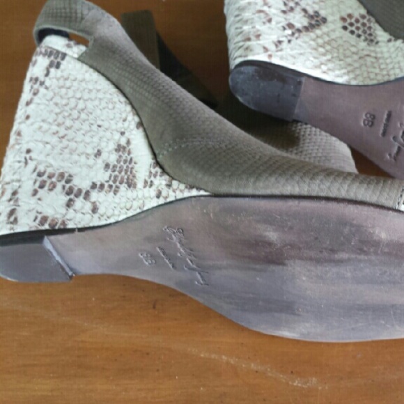 Thesefabulous shoes were worn once. BEAUTIFUL DETAIL..OLIVE GREEN .. DOUBLEELASTICHEEL STRAPS..SIZE 8..FAUX SNAKESKIN WEDGE 4in.HEEL.$365 new.