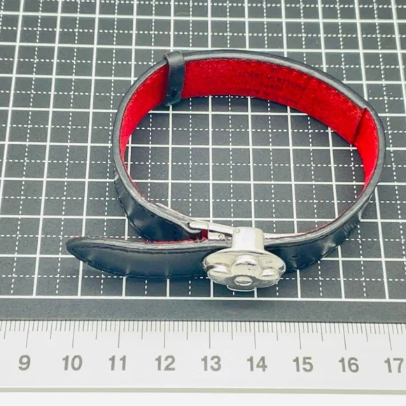 This is a Louis Vuitton adjustable "Good Luck" monogram bracelet. It has the signature 5 stamps on the black exterior leather with the code SN0071 on the red interior. Fits up to 16-18 cm around. Band width of 1.5 cm and charm measuring 1.8 cm. There are slight scratches on the silver charm but overall great condition. If you are interested please make an offer.