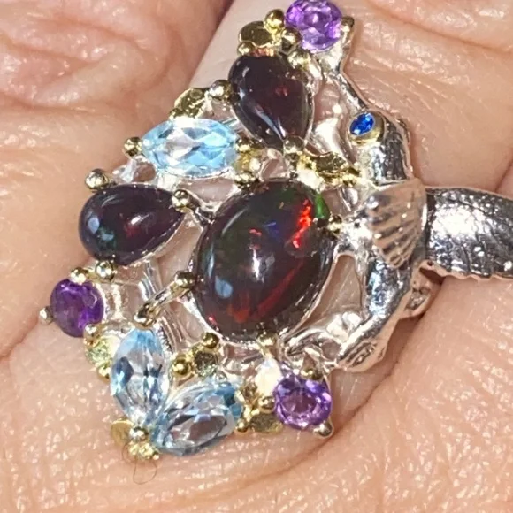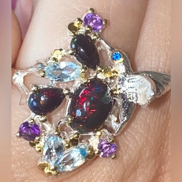 The “Hummingbird “ ring! Genuine Ethiopian Black Opals, artistically accented with sky blue Topaz, Amethyst. 925 sterling silver with 14 K white gold overlay and yellow gold...