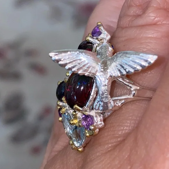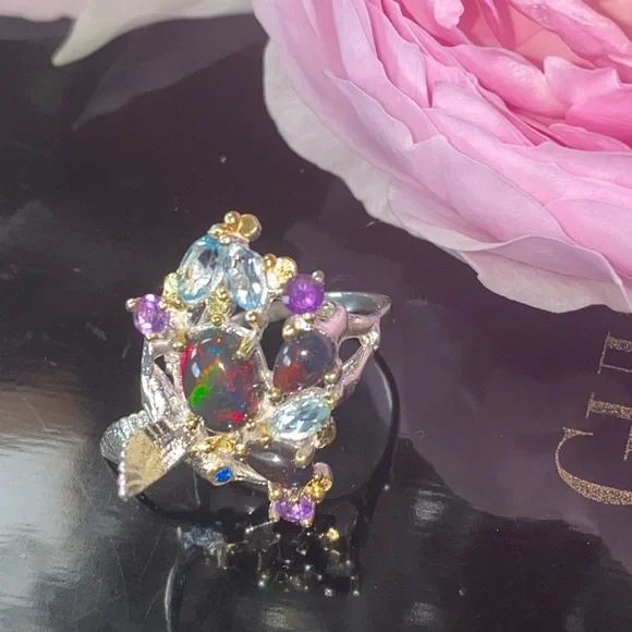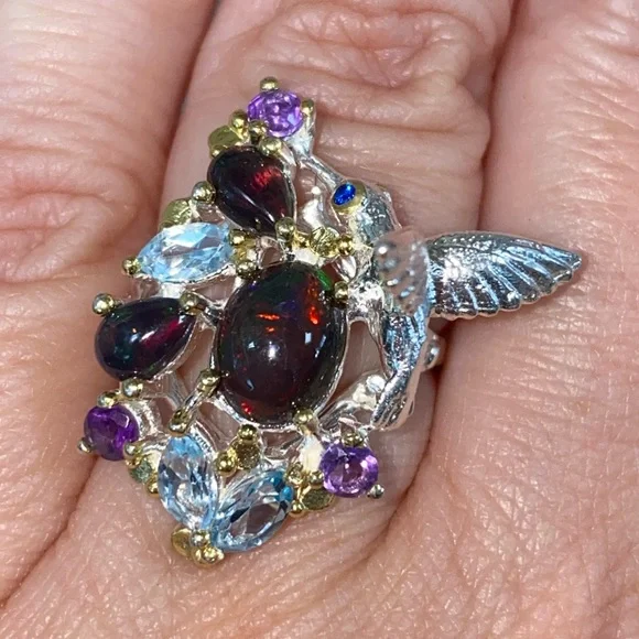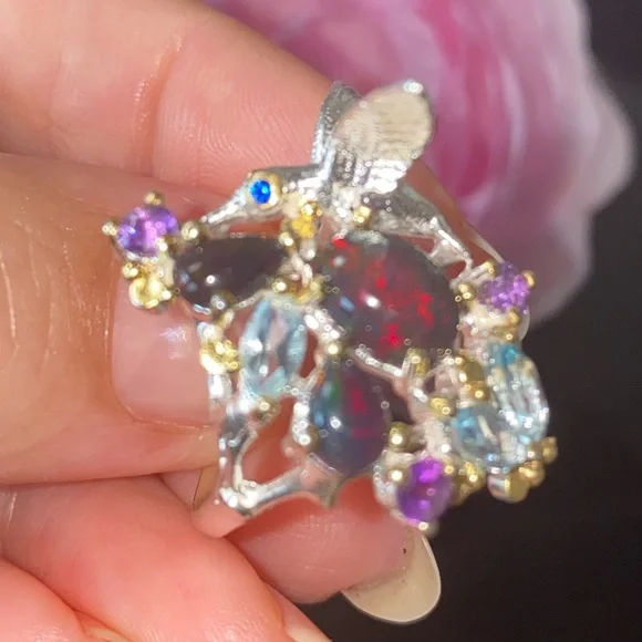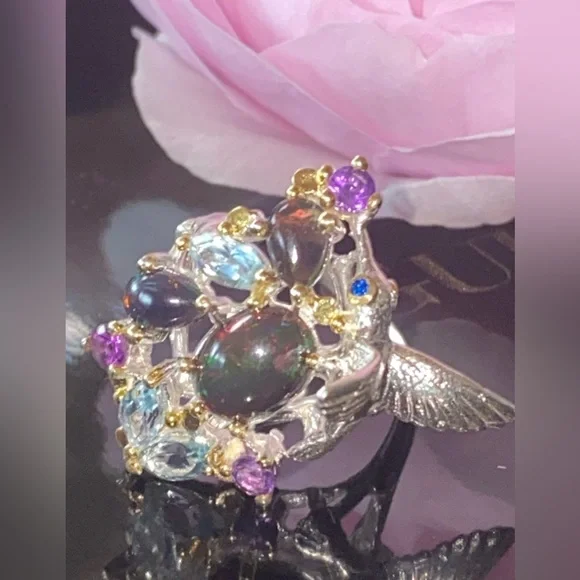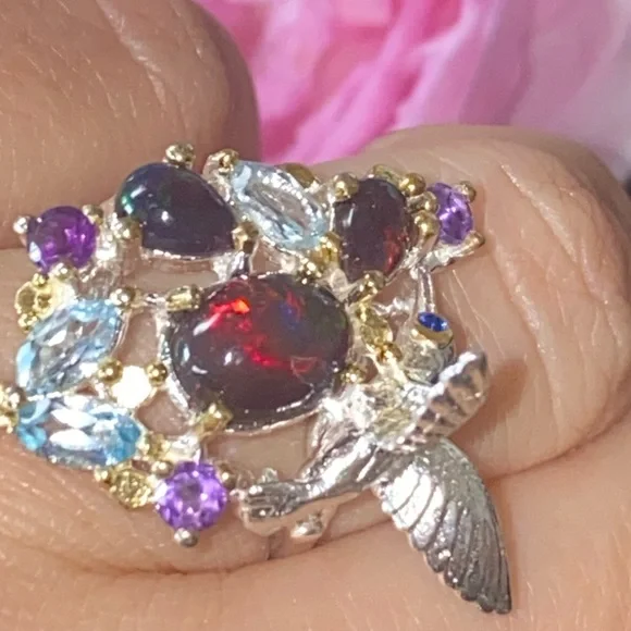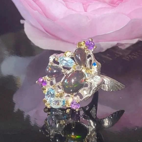 The “Hummingbird “ ring! Genuine Ethiopian Black Opals, artistically accented with sky blue Topaz, Amethyst. 925 sterling silver with 14 K white gold overlay and yellow gold accents. So unbelievably beautiful, feminine and one of a kind!Brand new, pristine condition