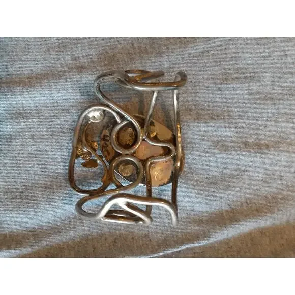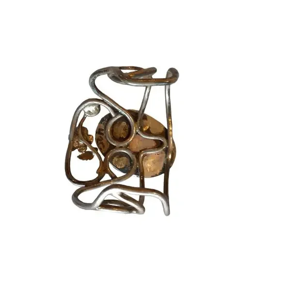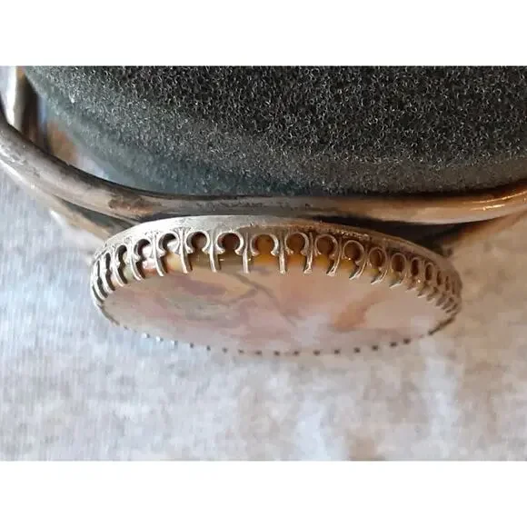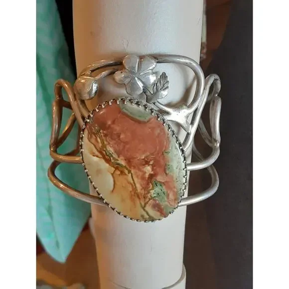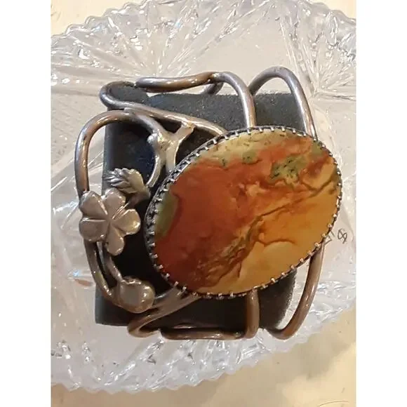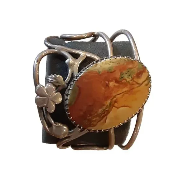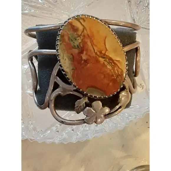 This stunning bracelet is a true piece of art. Crafted with care by hand, it features a beautiful oval-shaped polished stone that is sure to catch the eye. The stone is set in a sterling silver bracelet, which is also signed by the artist.With a vintage feel and a touch of beauty, this bracelet is perfect for any fashion-conscious individual. It is a unique piece that will complement any outfit. Whether you´re looking for a statement piece or simply a beautiful accessory, this bracelet is sure to impress.