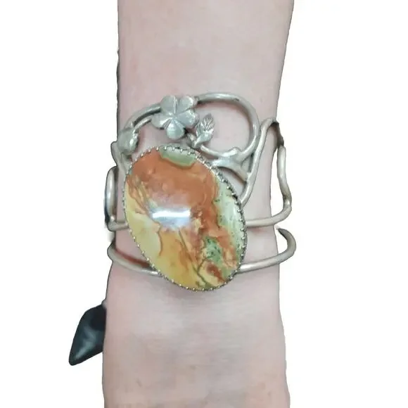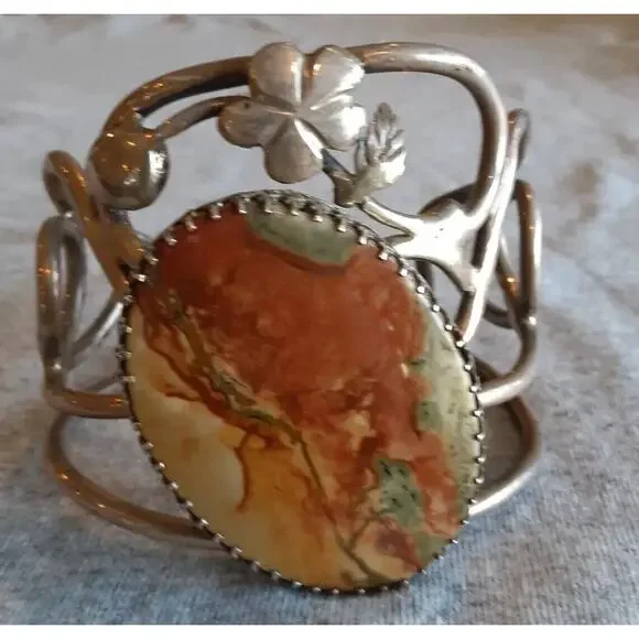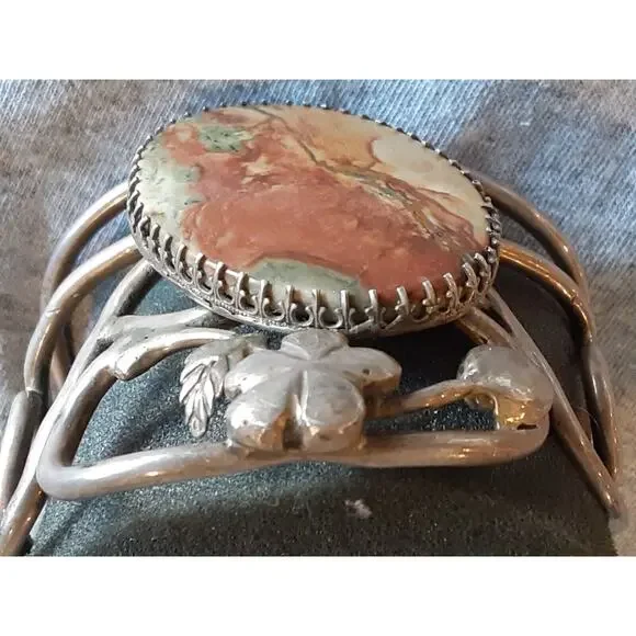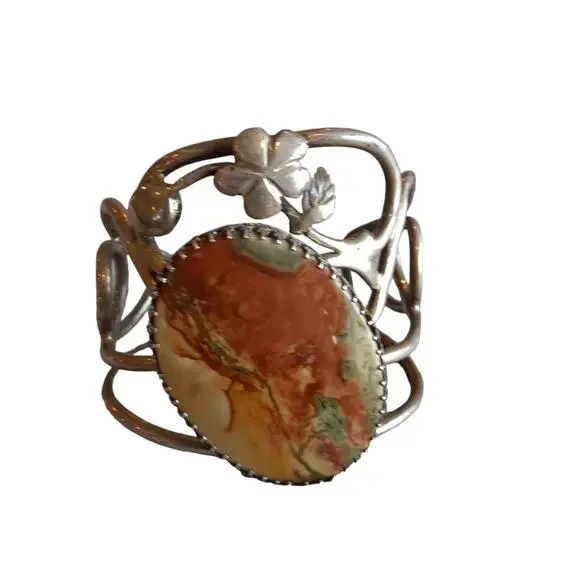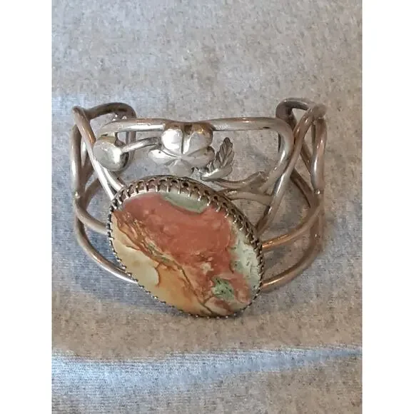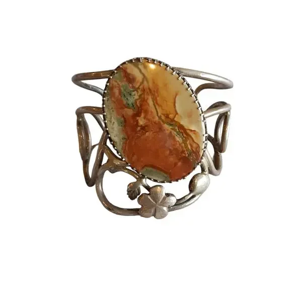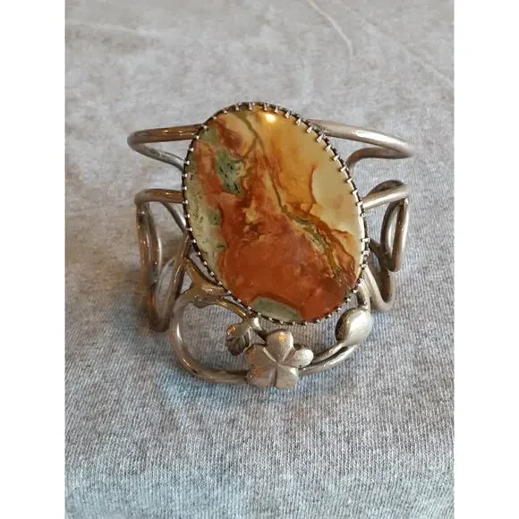 Large Polished Jasper Stone Bracelet Sterling Signed Bill Wickham Artisan Cuff