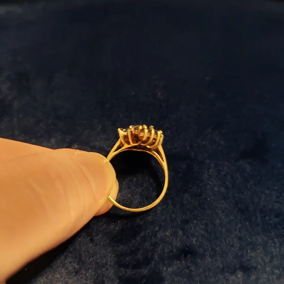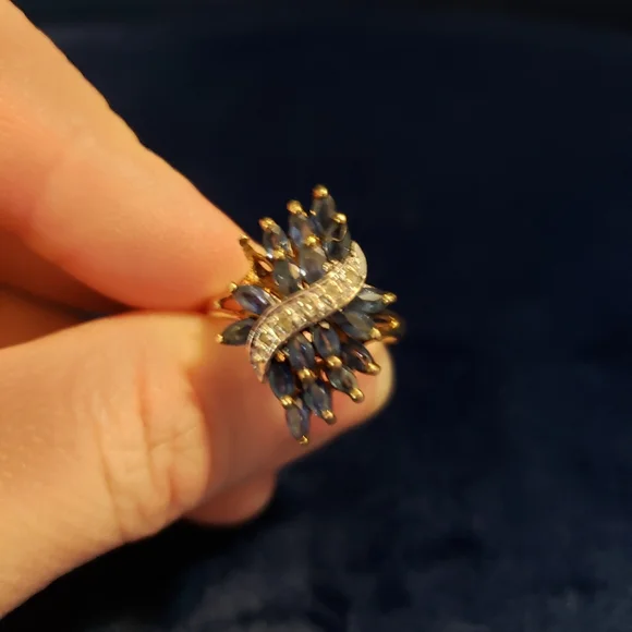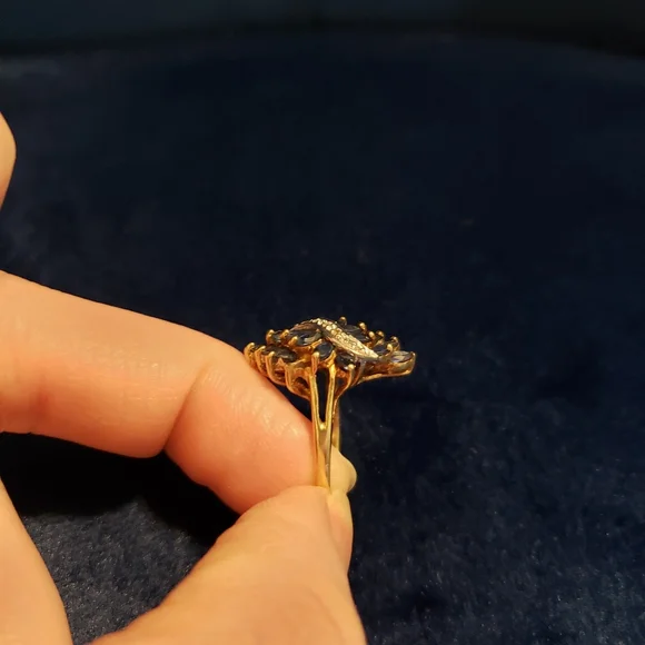10K Gold Marquise Blue Sapphire and Diamond Ring. Size 7. Missing one blue sapphire stone (see picture). beautiful ring even so. discounted accordingly. All diamonds present.