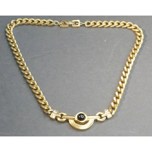 Vintage Signed Givenchy 1980 Heavy Bold Chain Necklace With Black Center & CrystalsType: NecklaceSize: about 15.25" from end to endSigned: Givenchy 1980Color: gold black...