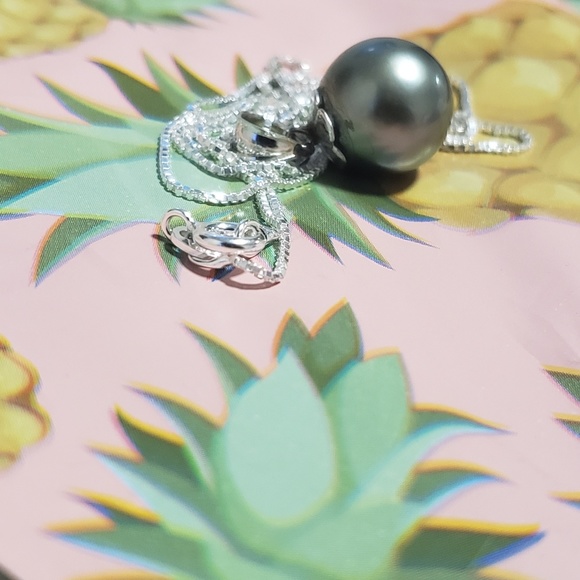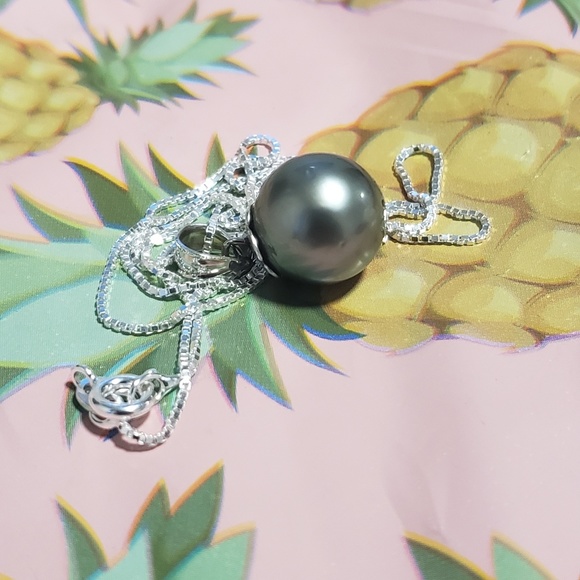 New 14kt white gold pendant with a 12mm tahitian pearl. Necklace is silver.