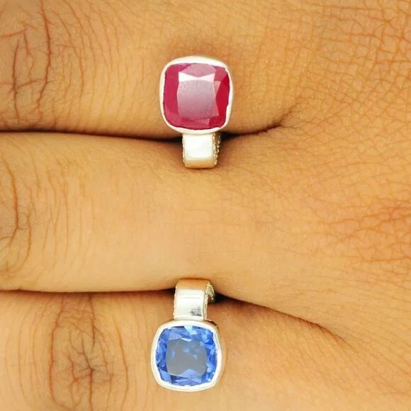Unique 925 Sterling Silver 5.50Cts Ruby & Tanzanite Between The Finger RingIf you are looking for that unique design and ring to capture attention, this is it.It has ruby and tanzanite that will adorn two different fingers.It is comfortable to wear and again so unique with synthetic diamonds mounted on the front and back of the band of sterling silver.Please see pictures for more details.Total Carat Weight - ~5.5 CaratRuby Weight - 2.25 CaratBlue TanzaniteWeight - 2.35 CaratMan Made Diamond Weight - 0.40CtRing Size - Ring US SIZE 7.00 Type of Metal - Solid, Real, Genuine Sterling SilverMetal Stamp - 925Gem Type - Ruby & Tanzanite/Simulated DiamondStone Shape - Cushion Brilliant CutRubyColor - Red (As Depicted)Tanzanite Color - Blue (As Depicted) Ruby Grade - AATanzaniteGrade - AAOrigin of Ruby -BurmaOrigin ofTanzanite- TanzaniaMan Made Diamond Color - Clear- White(D Color)Man-Made Clarity - Flawless (Better Than VVS-VS-OR SI Natural Diamonds)