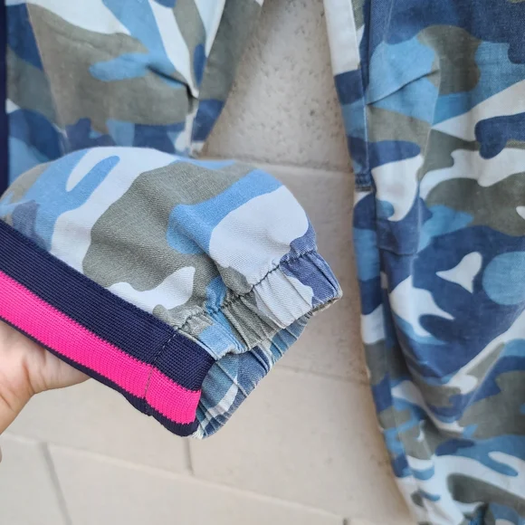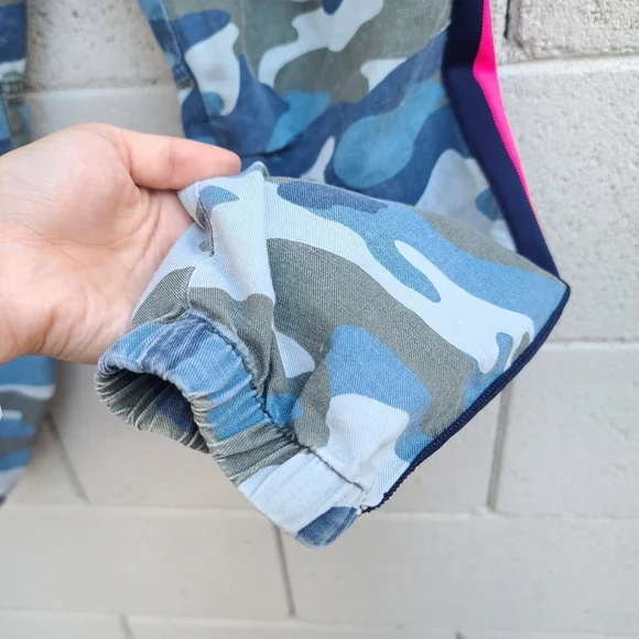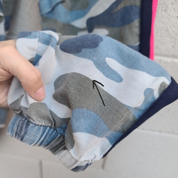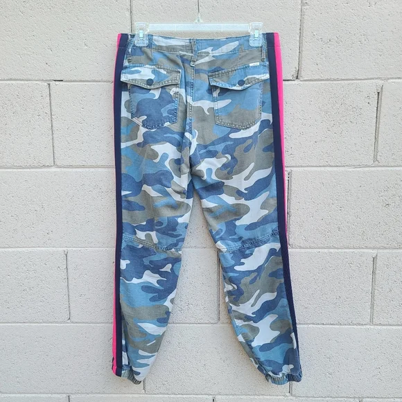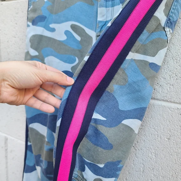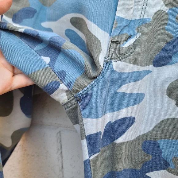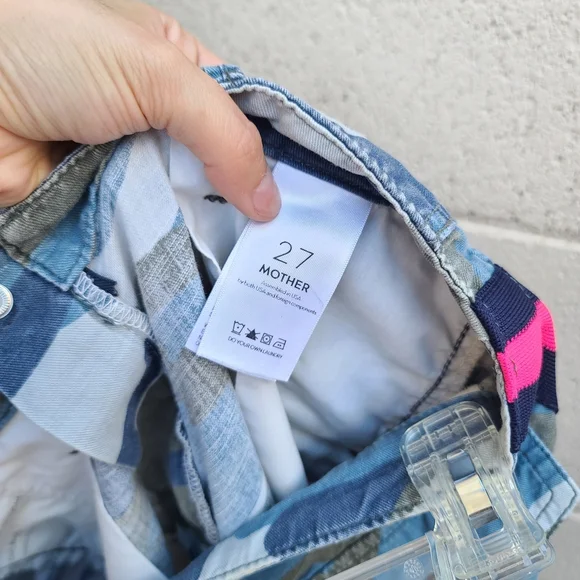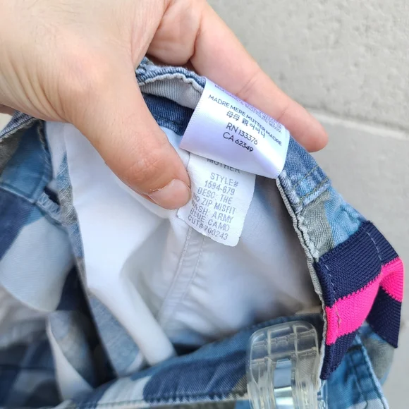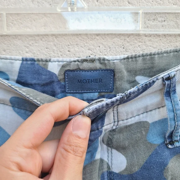 MotherSize 27Good pre-owned condition, has some wash wear. Tiny stain on back waist and left front hem. Thin fabric on back left pocketNo Zip Misfit in Army Blue Camo54% cotton, 23% lyocell, 23% linenZipper fly with snap button closureFront and back pocketsContrast side stripingElasticized leg openingsApproximate measurements lying flat:Waist: 15inRise: 10inInseam: 25in
