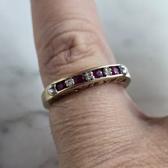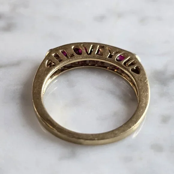 A WOMENS VINTAGE ESTATE 10K YELLOW GOLD DIAMOND & RUBY " I LOVE YOU" RING.THE TOTAL WEIGHT IS 2.8g, AND IS A SIZE 6.5.THE WIDTH OF THE RING IS 1/8".ANY QUESTIONS PLEASE DONT...