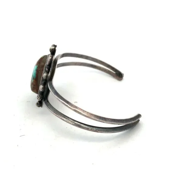 * Vintage 925 Sterling Silver Cabochon Turquoise Open Cuff Bracelet* Inner cuff measures: 5" * Gap measures: 1-1/2"* Top of bracelet measures: 1-1/4" x 1-1/4"* 1 Turquoise measures approximately 15.2 mm x 14.5 mm * Unmarked. * Professionally assayed. * Condition: As pictured. * S6167
