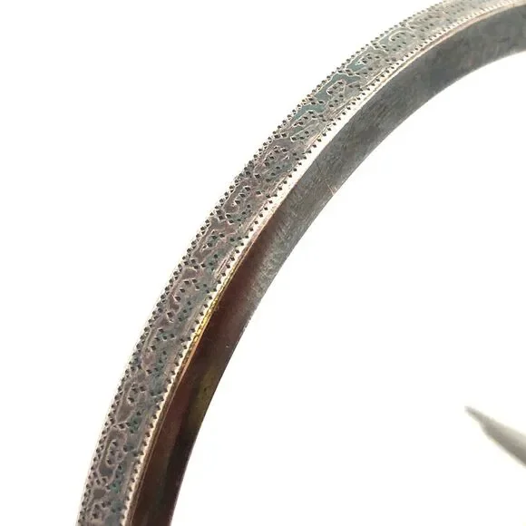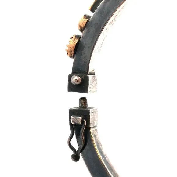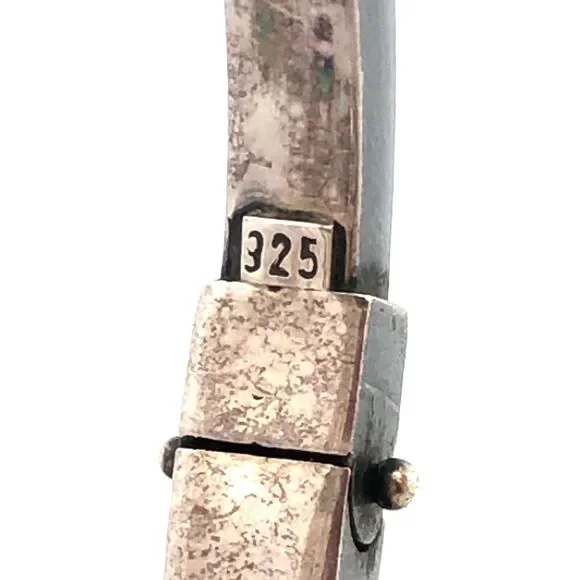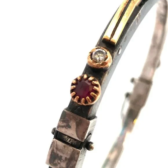 * Vintage 925 Sterling Silver Ruby Emerald White Amethyst Hinged Bangle Bracelet* Inner cuff measures: 7.0"* Width: 3/16"* One oval Ruby measures approximately 7.5 mm x 5.0 mm* 2 round Rubies measure approximately 4.0 mm each* 2 round Emeralds measure approximately 4.0 mm each* 2 round White Amethyst measure approximately 4.0 mm each* 6 round White Amethyst measure approximately 1.0 mm each* Weight: 15.9 tgw* Unmarked* Professionally assayed.* Condition: As pictured. Nice patina.* S6165